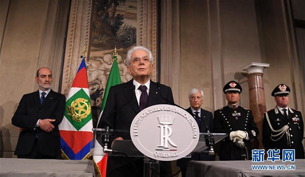 5月27日,在意大利首都羅馬,意總統(tǒng)馬塔雷拉發(fā)表講話。據(jù)當?shù)孛襟w報道,意大利新任總理孔特27日晚間與總統(tǒng)馬塔雷拉會面并提交擬定的內(nèi)閣成員名單時,馬塔雷拉否決了由意大利聯(lián)盟黨和五星運動力推的持疑歐立場的經(jīng)濟學家保羅·薩沃納出任財政部長。孔特向總統(tǒng)提出放棄組閣任務(wù)請求,請求得到總統(tǒng)確認。新華社發(fā)(阿爾貝托·林格里亞攝)