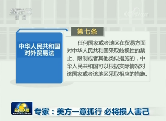 專家表示,中方采取的反制措施合理合法。根據(jù)《中華人民共和國對外貿易法》第七條,任何國家或者地區(qū)在貿易方面對中華人民共和國采取歧視性的禁止、限制或者其他類似措施的,中華人民共和國可以根據(jù)實際情況對該國家或者該地區(qū)采取相應的措施。