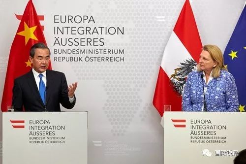 當(dāng)?shù)貢r(shí)間2018年7月5日,國務(wù)委員兼外交部長王毅在維也納同奧地利外長克奈斯?fàn)柟餐瑫?huì)見記者(圖自外交部)