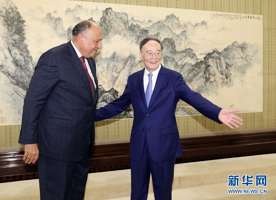 7月9日,國(guó)家副主席王岐山在北京中南海會(huì)見(jiàn)埃及外長(zhǎng)舒凱里。 新華社記者 丁林 攝