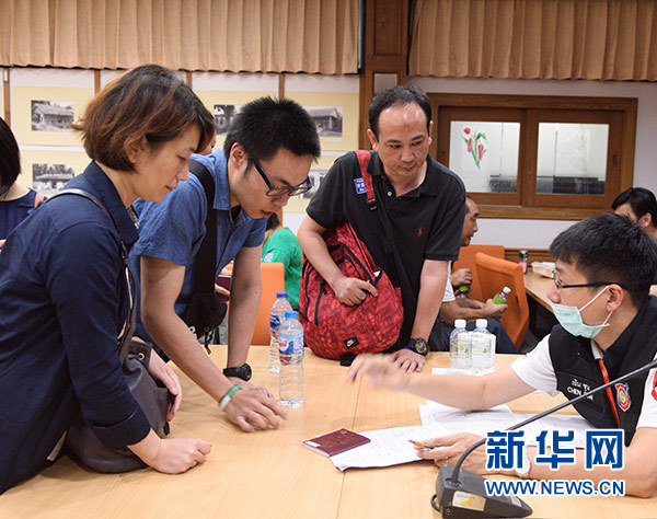 7月9日,在泰國普吉島的哇集拉醫(yī)院,來自蘇梅島的旅游警察志愿者(右)幫助遇難者家屬做確認(rèn)遺體登記工作。新華社記者 秦晴 攝