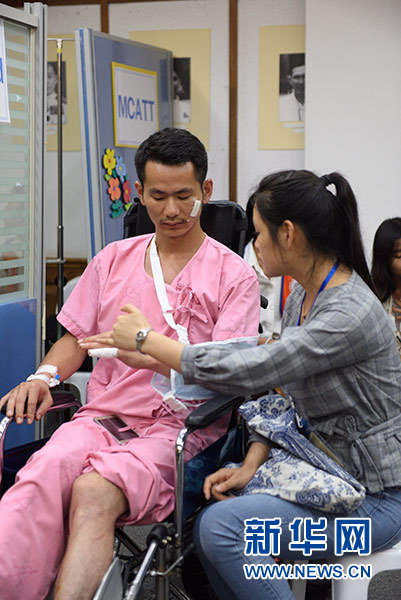 7月9日,在泰國普吉島的哇集拉醫(yī)院,一名華人志愿者(右)指導(dǎo)中國受傷游客活動(dòng)手指關(guān)節(jié)。新華社記者 秦晴 攝