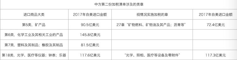 第二份清單,是從美進口的化工品、醫(yī)療設備、能源產品(包括煤炭、原油、成品油、液化石油氣等)等商品,2017年,中國自美國進口金額約160億美元。第二份清單是否執(zhí)行、生效時間將視美方行動另行宣布。