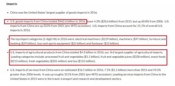 首先,從中方向美方的出口結構來看:2016年美國從中國進口總值4626億美元,是美國最大的商品供給方。進口額最高的是電子機械類產品(1290億美元),機器(970億美元),家具及寢具(290億美元),玩具及運動裝備(240億美元),鞋類(150億美元)。此外,從中國進口的農產品總額43億美元(這已經是美國第三大農產品供應方了),其中占比最高的是加工后的水果及蔬菜(11億美元),水果及蔬菜汁(3.28億美元),快餐休閑類食品(2.13億美元),新鮮蔬菜(2.05億美元)及茶葉(1.52億美元)。