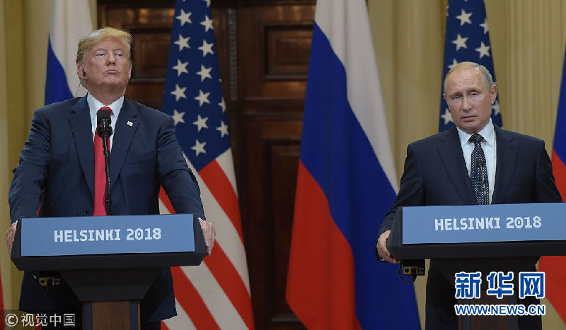 當(dāng)?shù)貢r間2018年7月16日,芬蘭赫爾辛基,美國總統(tǒng)特朗普與俄羅斯總統(tǒng)普京出席聯(lián)合新聞發(fā)布會。(圖片來源:視覺中國)