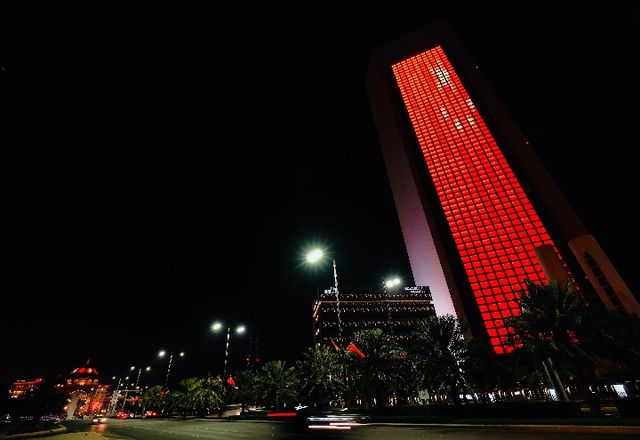 2018年7月18日夜晚拍攝的阿布扎比國(guó)家石油公司大樓。新華社記者 鄭開(kāi)君攝