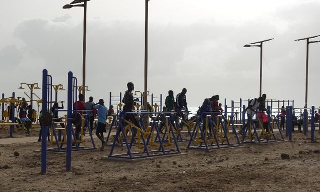 2018年7月18日,塞內(nèi)加爾首都達喀爾,當?shù)孛癖娫跒I海大道健身公園內(nèi)鍛煉。(新華社記者賴向東攝)