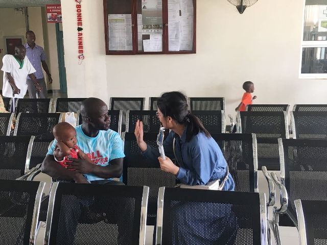 2018年7月18日,中國援建塞內(nèi)加爾兒童醫(yī)院候診室,蘇利曼·費迪奧爾抱著孩子接受記者采訪。(新華社記者蔣國鵬攝)