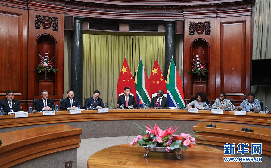 習(xí)主席對南非進(jìn)行國事訪問期間,兩國元首就推進(jìn)新時(shí)期中南全面戰(zhàn)略伙伴關(guān)系達(dá)成重要共識,一致同意加強(qiáng)高層往來,深化政治互信,對接發(fā)展戰(zhàn)略,推進(jìn)務(wù)實(shí)合作,密切人文交流,讓兩國人民更多享受中南合作成果。