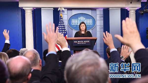 8月2日,在美國首都華盛頓,白宮發(fā)言人桑德斯出席記者會。新華社記者劉杰攝