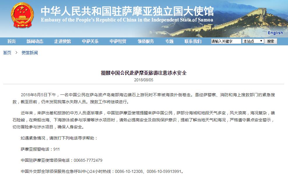 據(jù)中國駐薩摩亞大使館網(wǎng)站消息,當(dāng)?shù)貢r間2018年8月5日下午,一名中國公民在薩烏波盧島南部海邊礁石上游玩時不幸被海浪撲倒卷走。雖經(jīng)薩警察、消防和海上搜救部門的緊急搜救,截至目前,仍未發(fā)現(xiàn)落水失蹤人員。搜救工作將繼續(xù)進行。