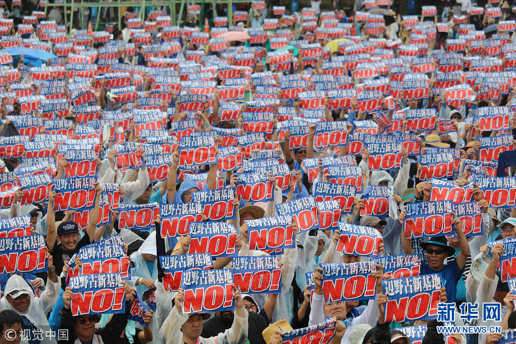 當(dāng)?shù)貢r間2018年8月11日,日本沖繩縣約7萬民眾8月11日在那霸市舉行大規(guī)模集會,反對駐日美軍將普天間基地遷往名護(hù)市邊野古地區(qū),要求駐日美軍放棄在邊野古地區(qū)新建基地并立即關(guān)閉普天間機(jī)場。當(dāng)天,日本東京都、大阪府、福岡、北海道縣等地民眾也同時舉行集會和游行,抗議日本政府推進(jìn)邊野古地區(qū)填海施工。(圖片來源:視覺中國)