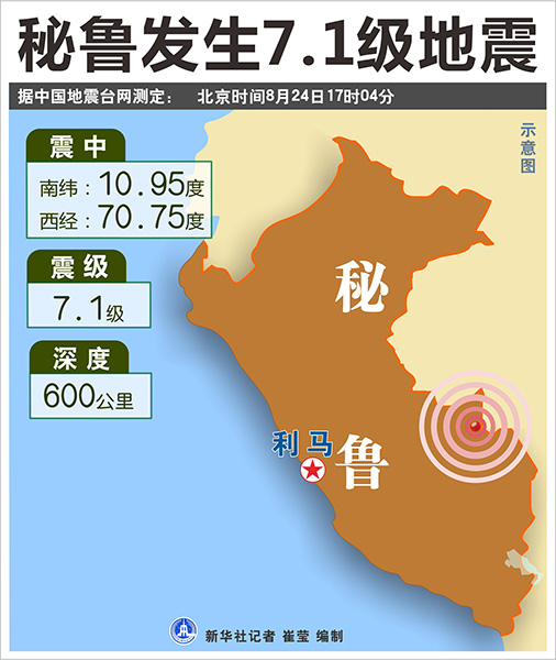 新華社利馬8月24日電? 秘魯東部與巴西交界地區(qū)24日發(fā)生7.1級地震,目前尚無人員傷亡和財(cái)產(chǎn)損失報(bào)告。