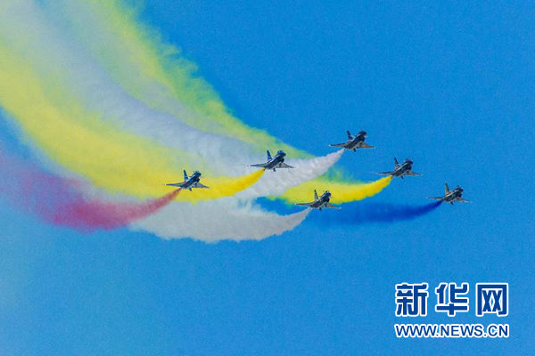 蔚藍的天空下,八一飛行表演隊成功上演了六機向下開花、五機水平向上開花、四機編隊橫滾、單機蛇行扭轉等21個高難度飛行動作,贏得了現場觀眾陣陣掌聲。