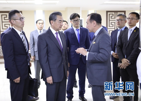 王毅訪問蒙古國(guó)期間,25日在蒙古國(guó)外長(zhǎng)朝格特巴特爾的陪同下專程來到烏蘭巴托成吉思汗國(guó)際機(jī)場(chǎng)考察“一帶一路”快速通道并現(xiàn)場(chǎng)了解情況。