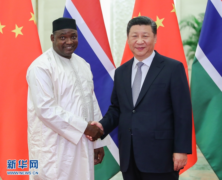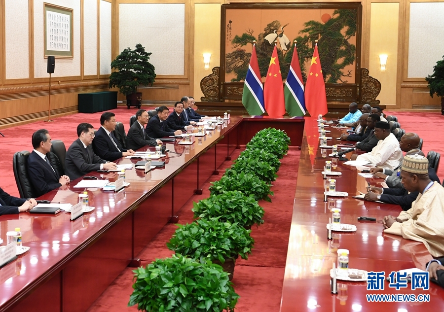 習(xí)近平歡迎岡比亞總統(tǒng)首次出席中非合作論壇會(huì)議,指出這對(duì)中岡關(guān)系、中非關(guān)系、論壇建設(shè)均具有重要意義。習(xí)近平強(qiáng)調(diào),中岡復(fù)交2年多來(lái),雙方友好合作全面、順利推進(jìn),雙邊關(guān)系發(fā)展得很好、很快,中方對(duì)兩國(guó)關(guān)系發(fā)展取得的成果感到滿(mǎn)意。中方贊賞總統(tǒng)先生和岡比亞政府堅(jiān)持一個(gè)中國(guó)原則,愿同岡方繼續(xù)把握好兩國(guó)關(guān)系的大方向,不斷增進(jìn)政治互信,繼續(xù)在涉及彼此核心利益和重大關(guān)切問(wèn)題上相互堅(jiān)定支持。中方支持岡比亞政府“建設(shè)新岡比亞”的努力,愿加強(qiáng)務(wù)實(shí)合作,擴(kuò)大人文交流。中方支持岡方加強(qiáng)和平安全能力建設(shè)。