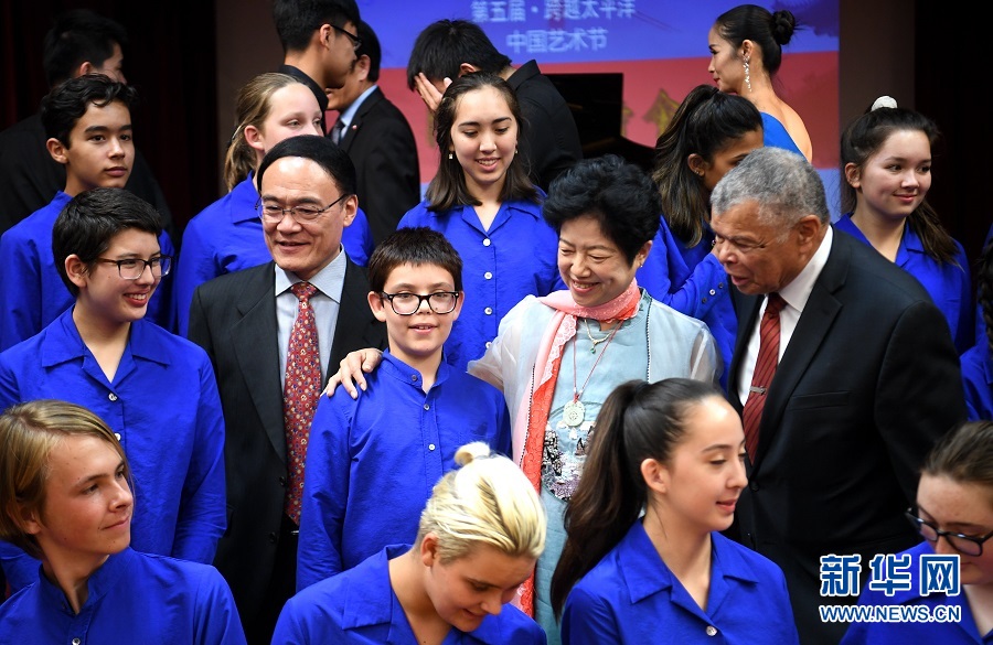 9月7日,在美國舊金山舉行的第五屆“跨越太平洋——中國藝術節(jié)”開幕式上,皮德蒙特東灣兒童合唱團成員與來賓合影。第五屆“跨越太平洋——中國藝術節(jié)”開幕式7日在中國駐舊金山總領事館舉行。美國民間友好團體、藝術界人士等230多人出席。 新華社記者吳曉凌攝