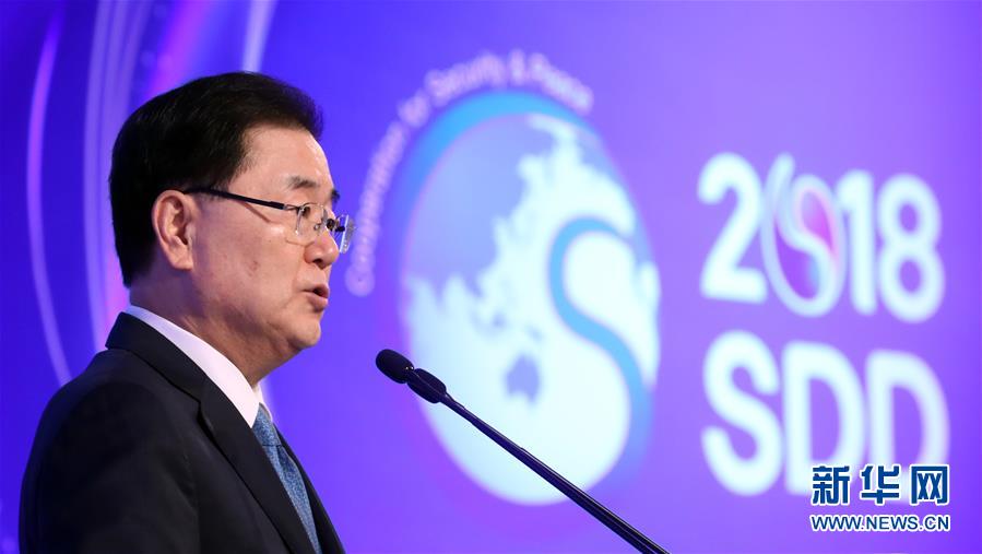 9月13日,在韓國首爾,韓國總統(tǒng)府青瓦臺國家安保室室長鄭義溶在“2018年首爾安保對話”開幕式上致辭。韓國總統(tǒng)府青瓦臺國家安保室室長鄭義溶13日表示,為從根本上消除可能導(dǎo)致韓朝雙方軍事沖突的危險因素,提升軍事互信水平,韓朝正就在軍事領(lǐng)域開展廣泛合作進(jìn)行協(xié)商并制定方案。 新華社/紐西斯通訊社