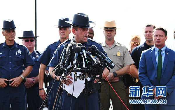 9月20日,在美國(guó)東部馬里蘭州哈福德縣,哈福德縣警長(zhǎng)杰弗里·加勒(前)在記者會(huì)上介紹槍擊案情況。新華社記者 劉杰 攝