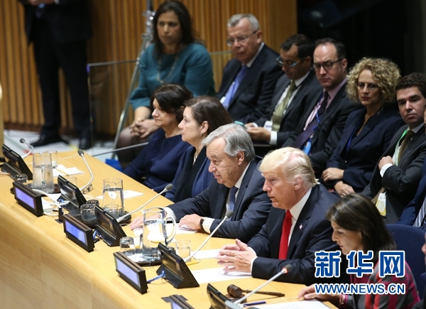 9月24日,在紐約聯(lián)合國(guó)總部,聯(lián)合國(guó)秘書長(zhǎng)古特雷斯(前排右三)出席“呼吁全球采取行動(dòng)應(yīng)對(duì)世界毒品問題”高級(jí)別會(huì)議。新華社記者秦朗攝