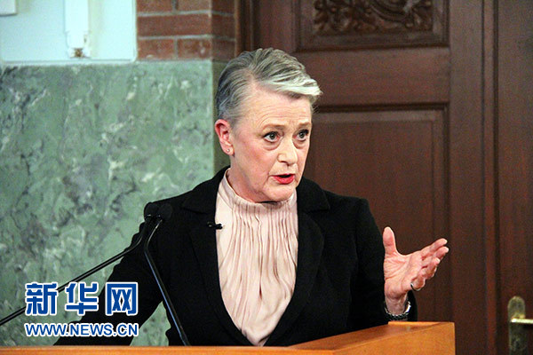 10月5日,在挪威首都奧斯陸,挪威諾貝爾委員會(huì)主席貝麗特·賴斯-安德森宣讀授獎(jiǎng)聲明。新華社記者 張淑惠 攝