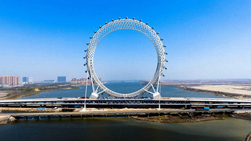 “渤海之眼”摩天輪由一個(gè)外層外形支承桁架組成。這個(gè)環(huán)形架由4600噸鋼梁建成,花兩年時(shí)間建造。有別于傳統(tǒng)的有軸摩天輪,渤海之眼摩天輪中間沒有任何支撐,運(yùn)行時(shí)輪盤不轉(zhuǎn)動(dòng),轎廂自帶行走機(jī)構(gòu),通過軌道沿輪盤轉(zhuǎn)動(dòng)。