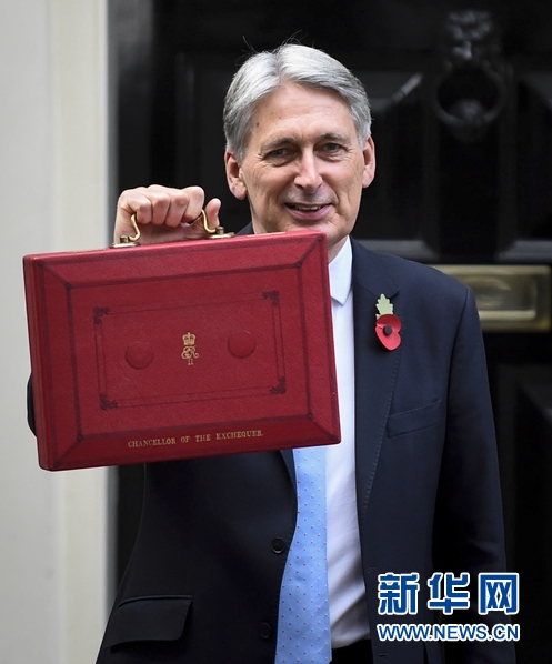 10月29日,在英國(guó)倫敦,英國(guó)財(cái)政大臣菲利普·哈蒙德展示手中的“預(yù)算盒”,準(zhǔn)備向議會(huì)提交預(yù)算案。當(dāng)天他在議會(huì)公布預(yù)算案時(shí)表示,英國(guó)將結(jié)束財(cái)政緊縮,努力爭(zhēng)取“脫歐”最好結(jié)果的同時(shí),為“脫歐”各種可能性做好準(zhǔn)備。 新華社發(fā)(史蒂芬·程 攝)