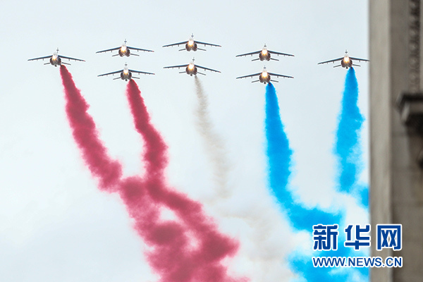 11月11日,法國空軍“法蘭西巡邏兵”飛行表演隊在一戰(zhàn)結(jié)束百年紀念儀式上飛過巴黎凱旋門。 新華社記者 鄭煥松 攝