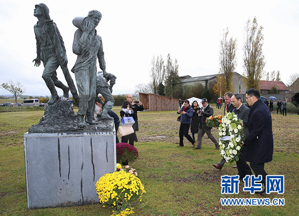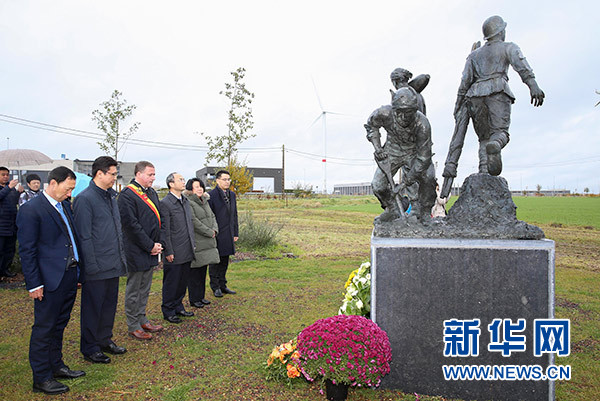 11月10日,在在比利時西佛蘭德省波珀靈厄市華工雕像園,中國駐比利時大使曹忠明(右二)、波珀靈厄市市長克里斯托弗·德雅蓋(右三)等向華工雕像敬獻花圈。 新華社記者 葉平凡 攝