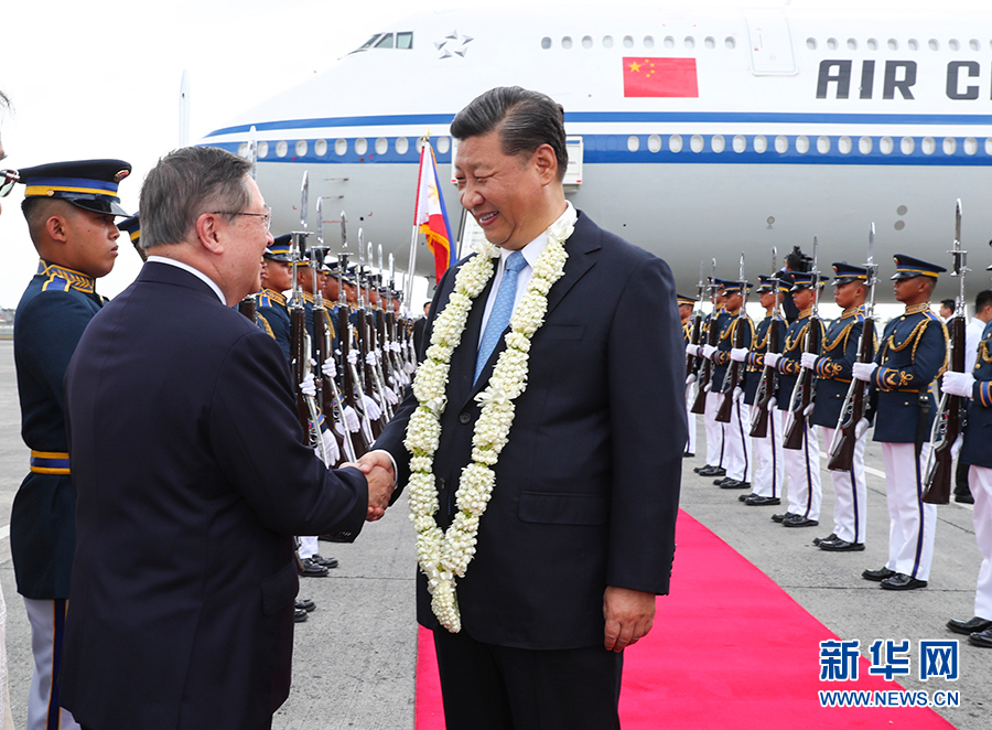 當(dāng)?shù)貢r間上午11時45分許,習(xí)近平乘坐專機抵達(dá)馬尼拉阿基諾國際機場。習(xí)近平步出艙門,菲律賓政府高級官員在舷梯旁熱情迎接,軍樂隊奏迎賓曲。禮兵分列紅地毯兩側(cè)。菲律賓青年向習(xí)近平獻(xiàn)上茉莉花環(huán)。