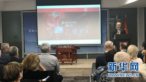 中國駐以色列大使詹永新在特拉維夫中國文化中心慶祝成立一周年活動(dòng)上致辭。新華社記者陳文仙攝