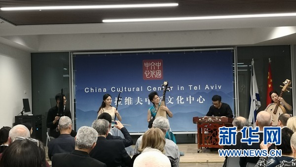中央音樂學(xué)院教授、琵琶演奏家章紅艷和團(tuán)隊(duì)在特拉維夫中國文化中心慶祝成立一周年活動(dòng)上民樂合奏。新華社記者陳文仙攝