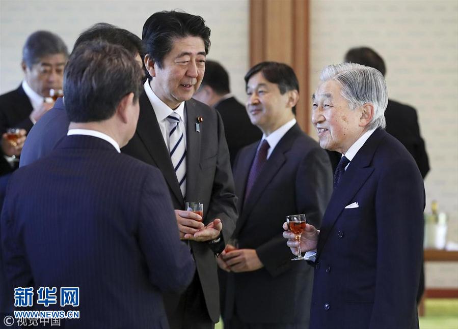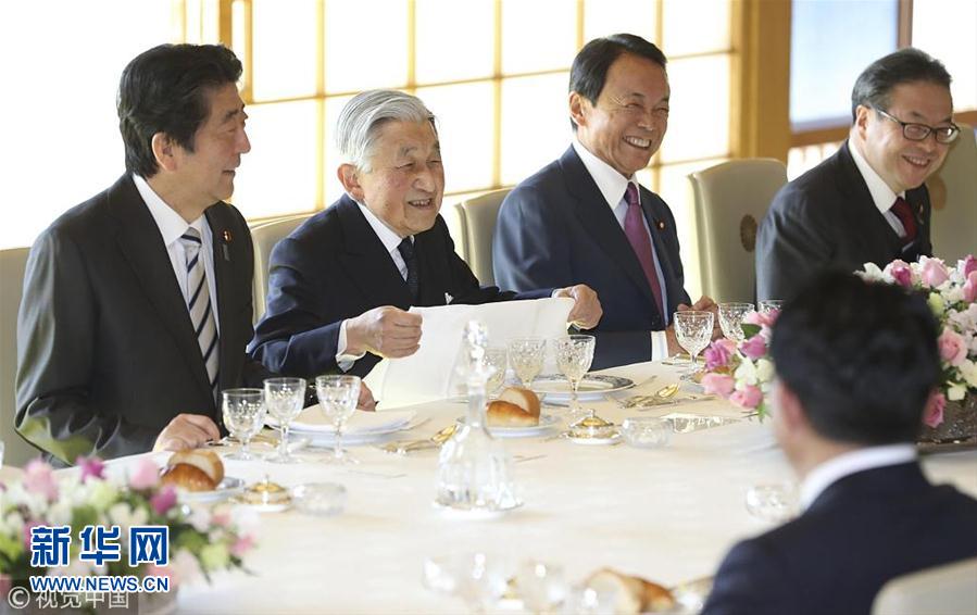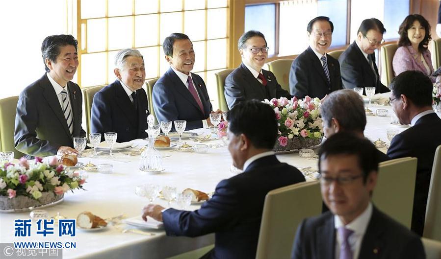 當?shù)貢r間2018年12月17日,日本東京,日本明仁天皇在皇宮與日本首相安倍晉三領(lǐng)導的政府高官共進年終午餐。(圖片來源:視覺中國)