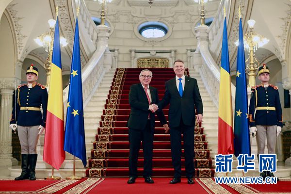 1月11日,羅馬尼亞總統(tǒng)約翰尼斯(中右)在布加勒斯特歡迎歐盟委員會(huì)主席容克。 新華社發(fā)(克里斯泰爾攝)