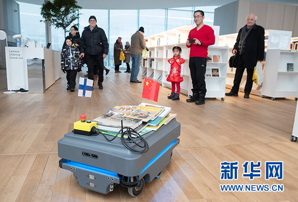 2月4日,機(jī)器人載著捐贈(zèng)的英文圖書在芬蘭赫爾辛基奧迪圖書館內(nèi)巡游展示,引得許多讀者駐足觀看。新華社發(fā)(馬蒂·馬蒂凱寧 攝)