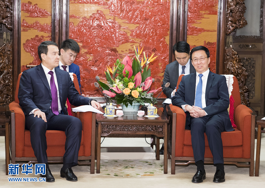 韓正表示,中哈是友好鄰邦和全面戰(zhàn)略伙伴。在習(xí)近平主席和納扎爾巴耶夫總統(tǒng)的戰(zhàn)略引領(lǐng)和親自推動(dòng)下,中哈關(guān)系保持高水平運(yùn)行,已成為國(guó)與國(guó)之間和睦相處、互利共贏的典范。雙方高層交往密切,政治互信不斷增強(qiáng),共建“一帶一路”成果豐碩。希望雙方進(jìn)一步發(fā)揮好中哈合作委員會(huì)重要作用,加強(qiáng)發(fā)展戰(zhàn)略對(duì)接,推進(jìn)經(jīng)貿(mào)、投資、海關(guān)、金融等領(lǐng)域務(wù)實(shí)合作,支持兩國(guó)企業(yè)按商業(yè)化市場(chǎng)化原則加強(qiáng)項(xiàng)目合作,推動(dòng)中哈合作不斷取得新進(jìn)展。