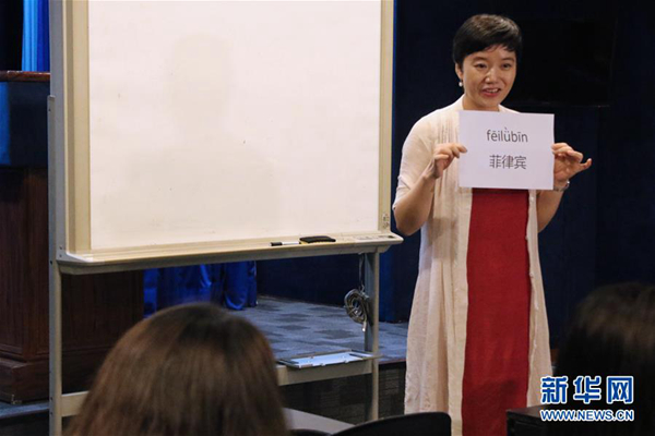 4月12日,在菲律賓馬尼拉,菲律賓大學孔子學院的老師孟廣潔為菲律賓總統(tǒng)府新聞部工作人員上課。新華社記者 鄭昕 攝