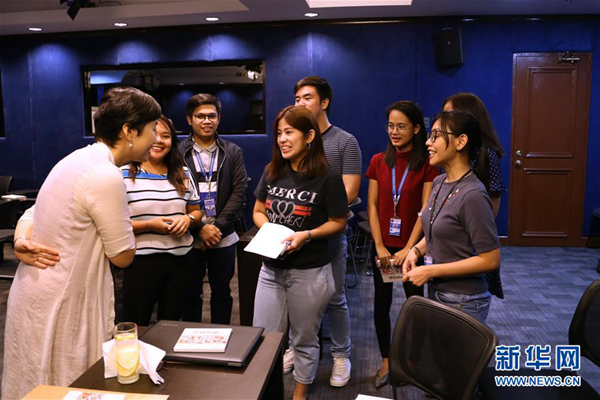 4月12日,在菲律賓馬尼拉,菲律賓總統(tǒng)府新聞部工作人員向菲律賓大學孔子學院的老師孟廣潔(左一)詢問漢語學習的各種問題。新華社記者 袁夢晨 攝