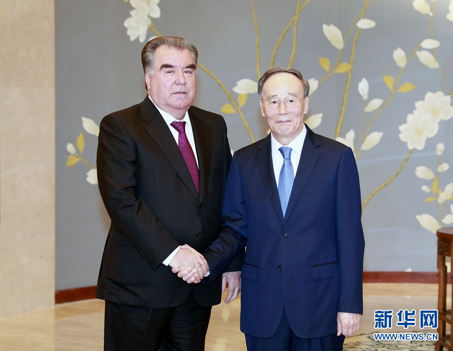 4月28日,國(guó)家副主席王岐山在北京釣魚(yú)臺(tái)國(guó)賓館會(huì)見(jiàn)塔吉克斯坦總統(tǒng)拉赫蒙。 新華社記者 丁林 攝