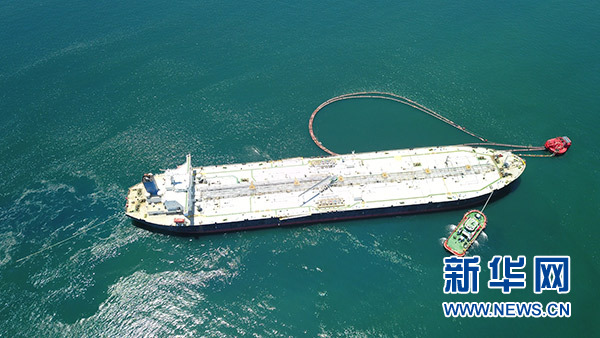 5月3日,一艘油輪在文萊海面上接卸恒逸石化大摩拉島綜合煉化項目所需原油(航拍照片)。 新華社發(fā)(恒逸實(shí)業(yè)供圖)