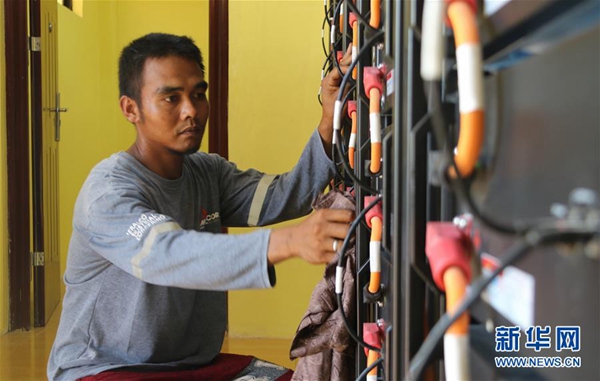 6月6日,在菲律賓北部偏遠(yuǎn)山區(qū)的巴利瓦特村,村民迪奧內(nèi)斯托·埃斯特萬在太陽能發(fā)電站進(jìn)行電力設(shè)備日常檢查和維護(hù)。新華社記者 鄭昕 攝