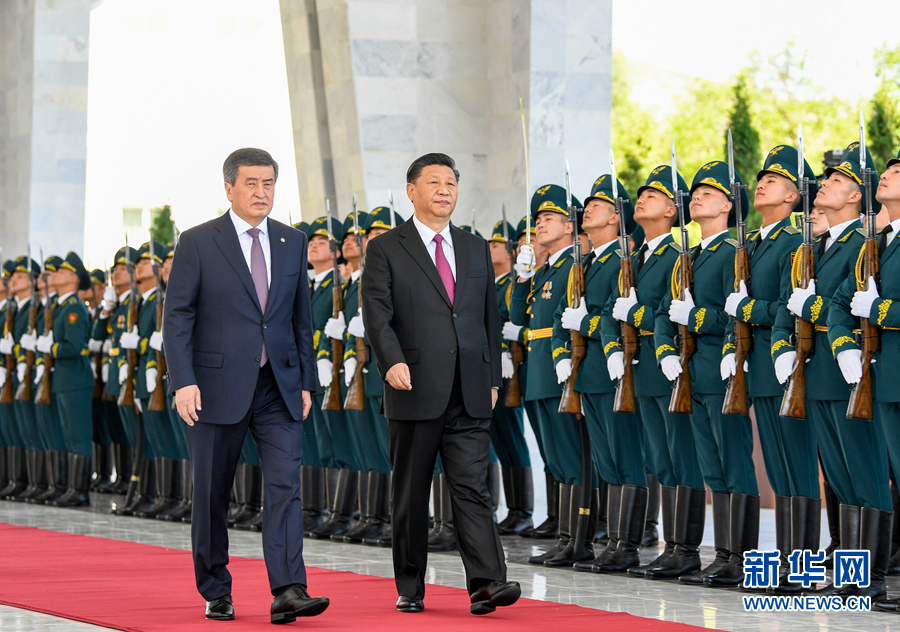 6月13日,國家主席習(xí)近平在比什凱克同吉爾吉斯斯坦總統(tǒng)熱恩別科夫會談。會談前,熱恩別科夫在阿拉爾恰國賓館會議中心前廣場為習(xí)近平舉行隆重歡迎儀式。這是兩國元首檢閱儀仗隊。 新華社記者 謝環(huán)馳 攝