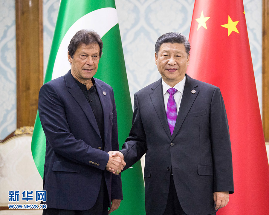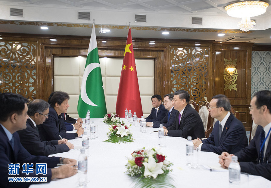 6月14日,國家主席習(xí)近平在比什凱克會見巴基斯坦總理伊姆蘭·汗。 新華社記者 李學(xué)仁 攝