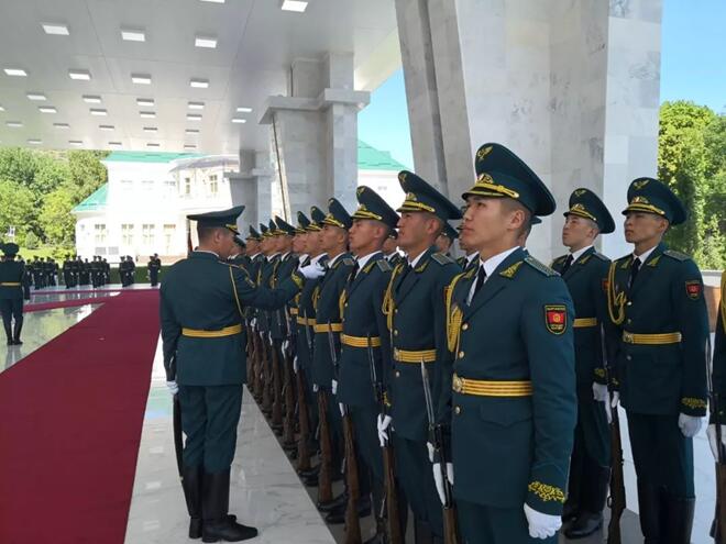 檢閱儀仗隊(duì)時(shí),習(xí)近平主席走到儀仗隊(duì)中央,用吉爾吉斯語(yǔ)向儀仗隊(duì)員問(wèn)候:戰(zhàn)士們好!儀仗隊(duì)員用吉爾吉斯語(yǔ)回答:歡迎您!