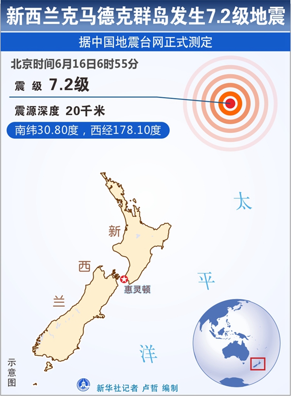 新華社快訊:中國(guó)地震臺(tái)網(wǎng)正式測(cè)定,6月16日6時(shí)55分,在新西蘭克馬德克群島(南緯30.8度,西經(jīng)178.1度)發(fā)生7.2級(jí)地震,震源深度20公里。