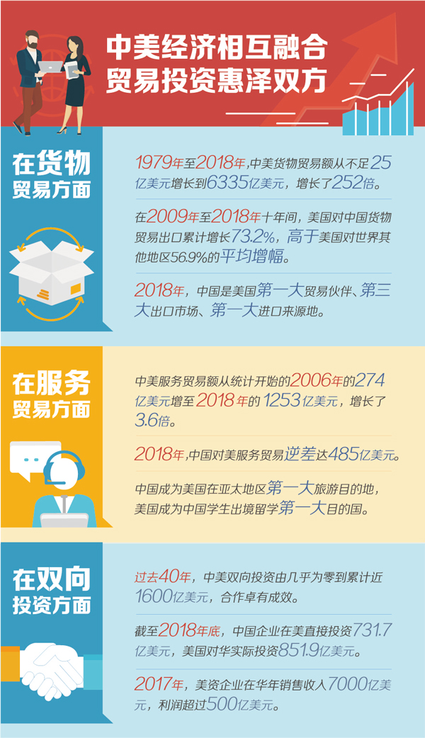 在國際經(jīng)濟(jì)合作中,正常的貿(mào)易關(guān)系是建立在等價(jià)交換基礎(chǔ)上的互惠互利關(guān)系,而不是你多我少、你輸我贏的“零和博弈”。國際貿(mào)易有利于推動資源在世界范圍內(nèi)優(yōu)化配置,促進(jìn)各國經(jīng)濟(jì)共同發(fā)展,推動人類社會共同進(jìn)步,國際貿(mào)易的歷史早已證明這樣的實(shí)踐是有效的,實(shí)踐經(jīng)驗(yàn)也早已成為國際經(jīng)濟(jì)學(xué)的基本原理,中美經(jīng)貿(mào)合作的事實(shí)也作了同樣的驗(yàn)證。中美建交以來,在雙邊貿(mào)易方面,1979年至2018年,雙邊貨物貿(mào)易額從不足25億美元增長到6335億美元,增長了252倍;在雙向投資領(lǐng)域,過去40年,中美雙向投資由幾乎為零到累計(jì)近1600億美元,中美互為對方重要投資伙伴,投資的雙向性和互惠性進(jìn)一步顯現(xiàn)。中美經(jīng)貿(mào)關(guān)系發(fā)展的歷程證明,中美通過優(yōu)勢互補(bǔ)、互通有無,有力促進(jìn)了各自經(jīng)濟(jì)發(fā)展和產(chǎn)業(yè)結(jié)構(gòu)優(yōu)化升級,雙方經(jīng)貿(mào)往來是惠澤彼此的關(guān)系,而非中國讓美國“吃虧”的過程。