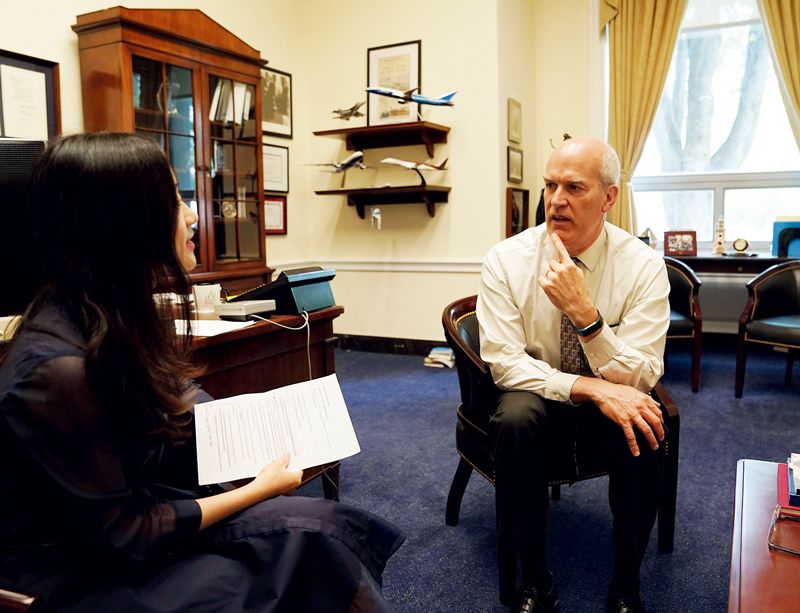 越來越多美國有識之士認(rèn)識到,美國政府加征關(guān)稅會損害美國民眾利益。圖為2019年5月9日,美國國會眾議院美中工作小組共同主席、華盛頓州民主黨聯(lián)邦眾議員里克·拉森(右)在華盛頓接受采訪時(shí)表示,美國政府對華產(chǎn)品加征關(guān)稅的做法損害美國工人與消費(fèi)者利益,不利于美國經(jīng)濟(jì),也無助于解決兩國經(jīng)貿(mào)問題。 新華社記者 劉杰/攝