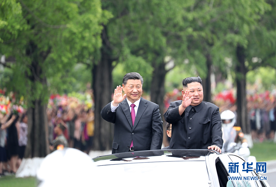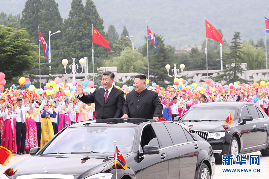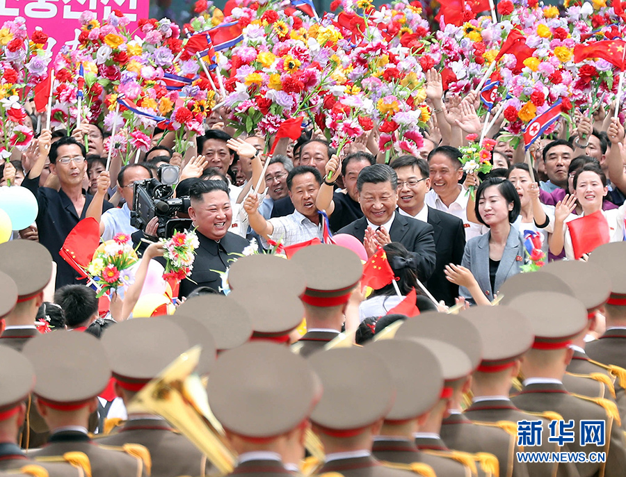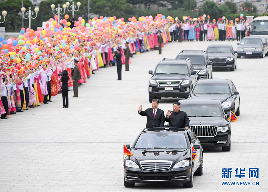習(xí)近平抵達黎明大街路口,換乘敞篷車,與金正恩同車前往錦繡山太陽宮廣場。街道兩旁,人山人海,盛況空前。歡迎民眾站在高坡上,從住宅樓的窗臺上,向中國貴賓歡呼致敬。到處都是熱情的笑臉,友好的歡呼聲不絕于耳。習(xí)近平和金正恩向歡迎的人群頻頻揮手致意。
