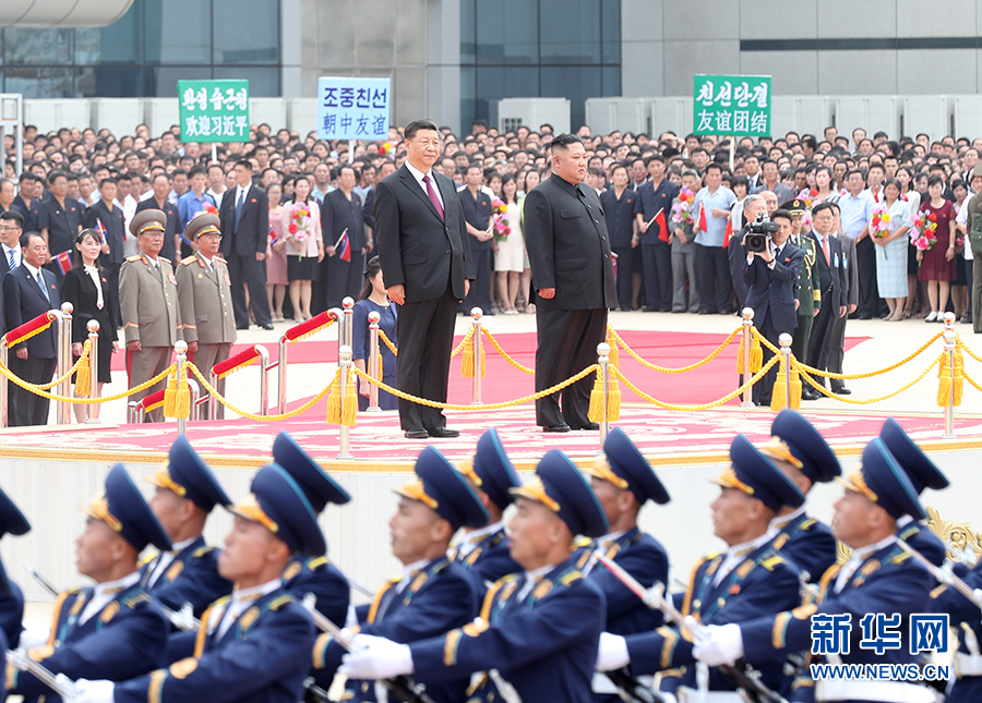 朝方在機場舉行隆重歡迎儀式。在21響禮炮聲中,軍樂隊奏中朝兩國國歌,習(xí)近平在金正恩陪同下檢閱了朝鮮人民軍三軍儀仗隊,并觀看了分列式表演。
