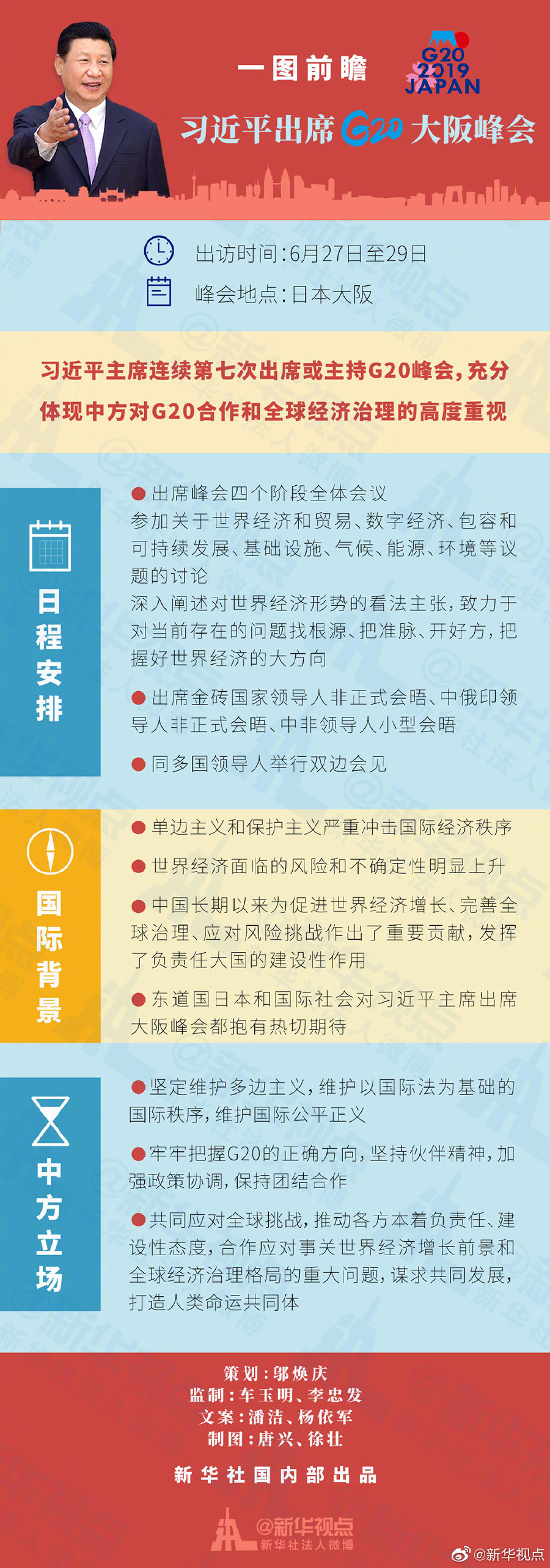 習近平主席將在G20大阪峰會上深入闡述對世界經濟形勢的看法主張,中方將與各方一道,堅定維護多邊主義,合作應對事關世界經濟增長前景和全球經濟治理格局的重大問題,謀求共同發(fā)展,打造人類命運共同體。在當前風云激蕩的國際形勢下,國際社會期待傾聽“中國聲音”。